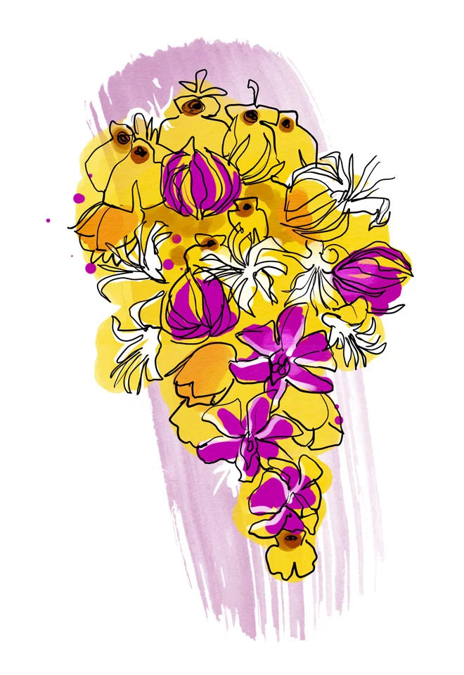Ileana cea contemporană, căreia îi plac provocările şi experimentele, este un personaj temerar, însă deopotrivă înzestrat cu o infinită delicateţe şi feminitate. Buchetul ei este un scut reinterpretat: cu o linie modernă, arcuită, cu un volum destul de mare, dar păstrându-şi transparenţa şi eleganţa, pe o structură din tulpini de grâu împletite, îmbină armonios flori gingaşe – precum oncidium galben, gloriosa galbenă, nerine albe si fritillaria – cu dendrobium, pentru accent. Să nu uităm că Ileana din poveste se apără de răul lumii prin puterea ancestrală şi magică a florilor.