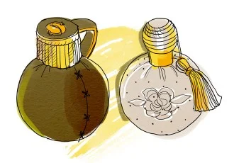 A ei, într-o sticluţă înfăşurată în broderie, a lui, îmbrăcată într-un material de inspiraţie militară.
