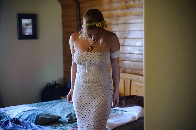 Silueta perfectă a Laurei este pusă în evidenţă de o rochie diafană şi sexy în acelaşi timp: albă, din muselină de mătase, cu accente de dantelă vintage şi croială tip „sirenă”, urmăreşte fidel linia corpului şi se termină cu o trenă senzuală. Pe spate i se revarsă plete blonde, naturale – este o adevărată Ileană-amazoană, o femeie independentă, puternică, frumoasă. O cununiţă de flori naturale, delicate, culese parcă acum din cea mai aleasă grădină, îi subliniază feminitatea.