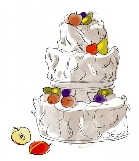 La fel de natural şi fresh ca întreaga nuntă, tortul ne duce cu gândul la o livadă. Pe frişca proaspătă, întinsă „din cuţit”, se află fructe întregi, rostogolite neglijent, căzute parcă în iarbă: pere, renglote, mere de vară. Aromele vor fi proaspete, fructate, “încălzite” de două condimente senzuale: vanilie bourbon şi scorţişoară.