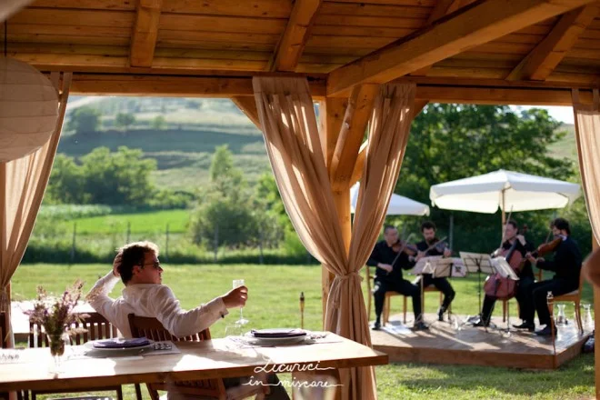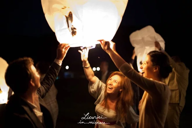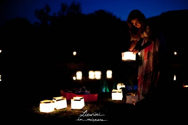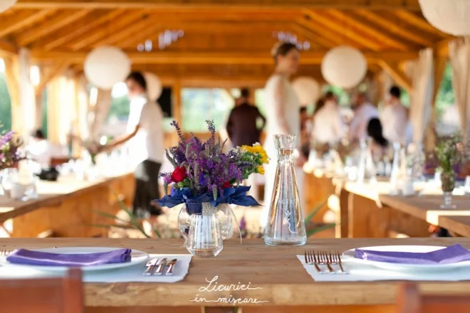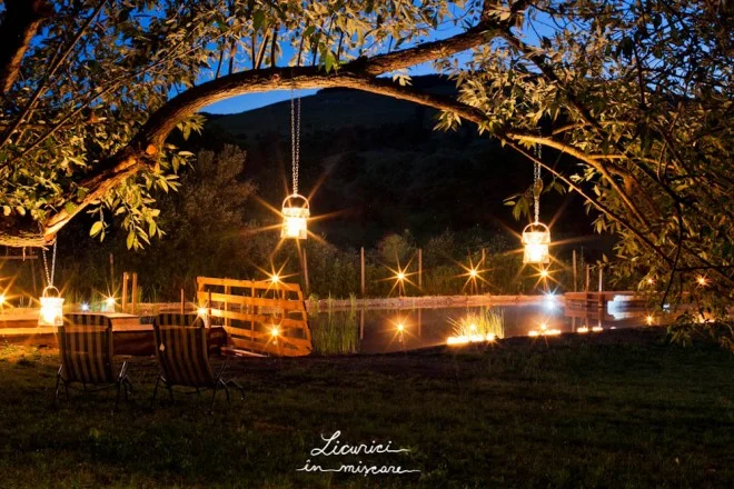 După ceremonie, ne mutăm lângă un pâlc de copaci din apropiere, la umbra cărora sunt aşezate mesele – într-un singur şir lung, şerpuit. La căderea serii, din crengile ce atârnă deasupra meselor se revarsă o lumină blândă, caldă: mici felinare cu lumânări şi beculeţe monocrome.